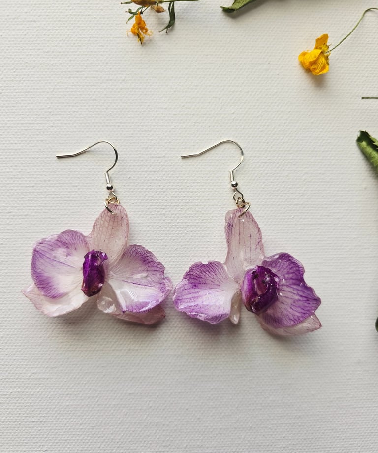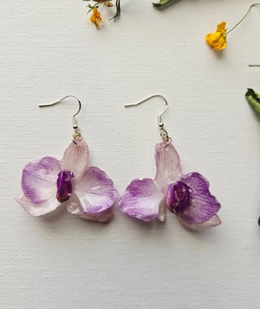 Discover one-of-a-kind handmade earrings crafted with real whole flowers, carefully preserved in bezels and custom molds!